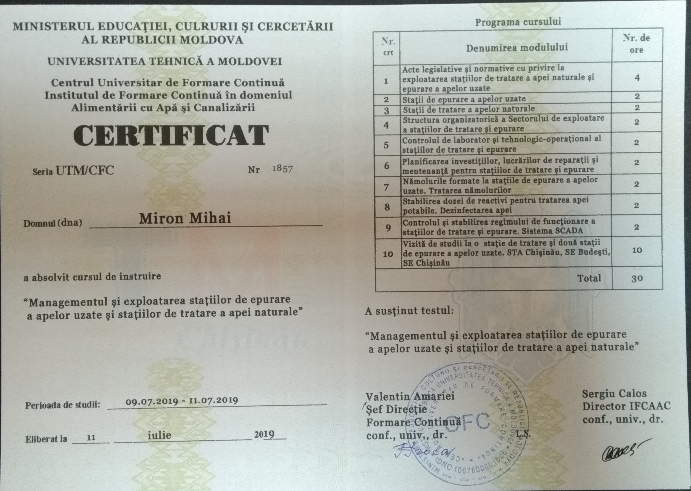 Astăzi, 09 iulie 2019, în cadrul Programului Național de Creștere a Capacităților Operatorilor din domeniul Aprovizionării cu Apă și Canalizării, s-a dat startul unui nou modul de instruire Managementul și exploatarea stațiilor de epurare a apelor uzate și stațiilor de tratare a apei potabile. Grupul 2 (limba rusă).